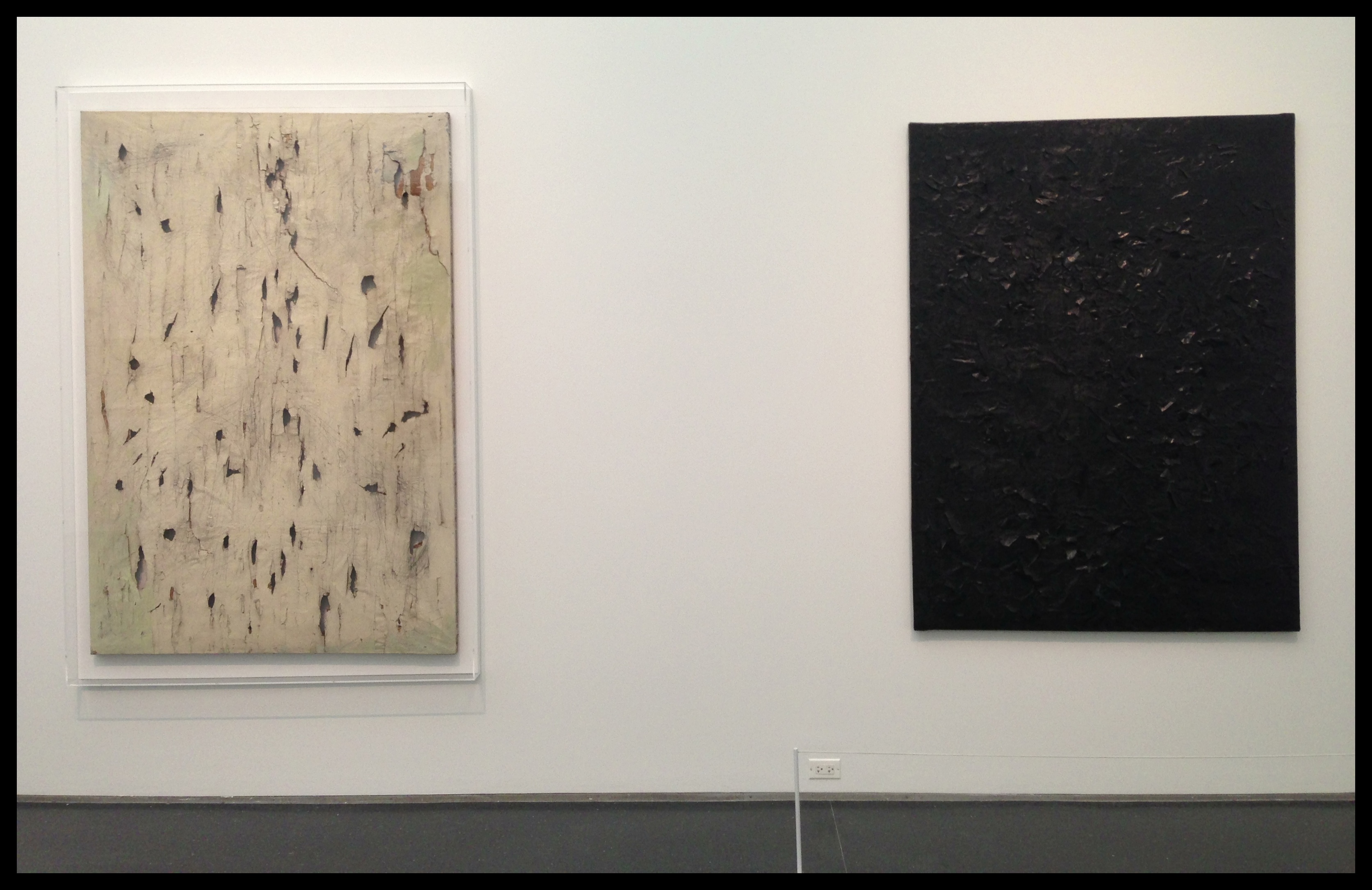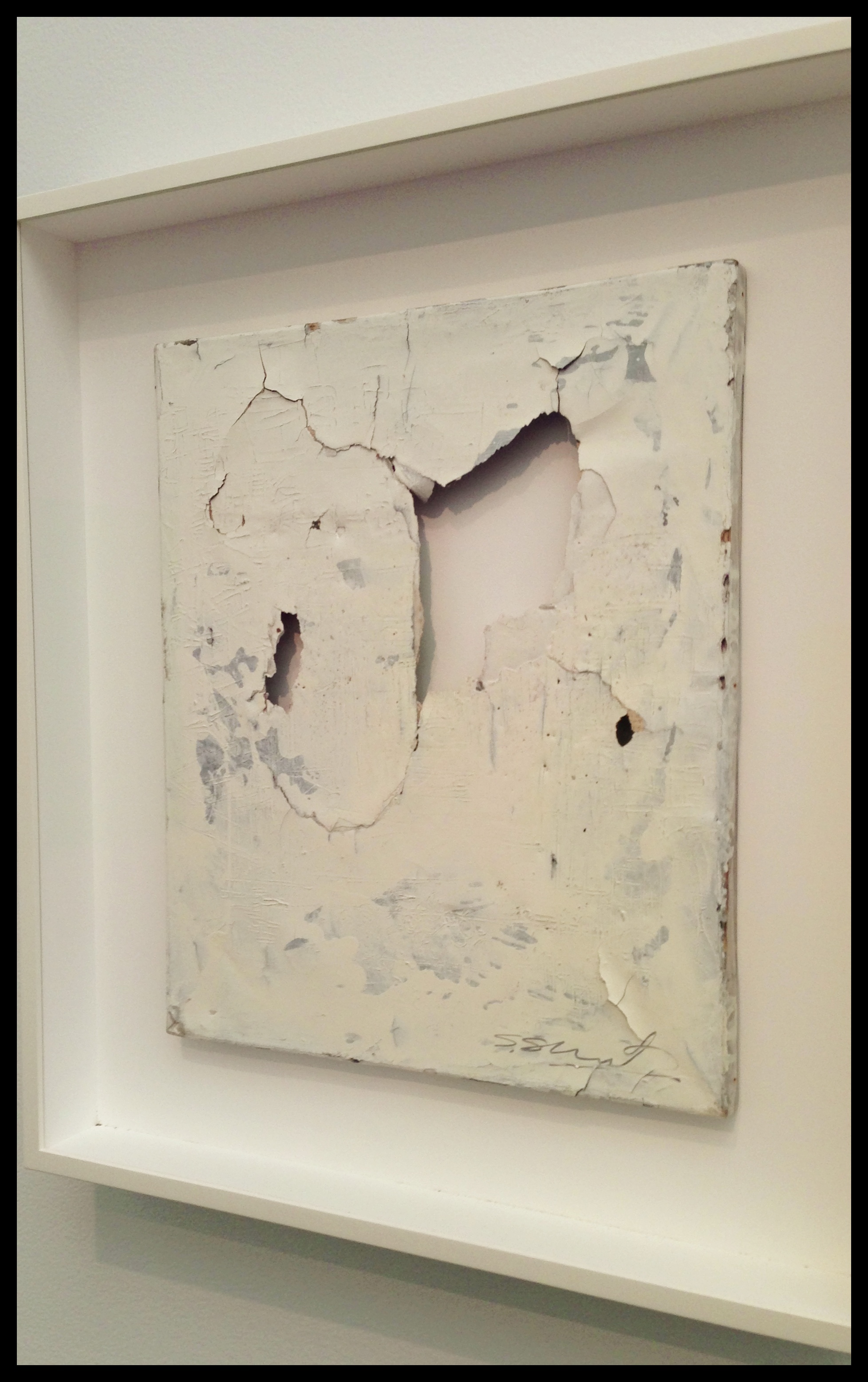 All of this makes for a great exhibition, but there was something more particular that brought me back to the MCA for successive visits. Walking through the galleries I was struck, pummeled really, by the overwhelming presence of matter. Destruction and violence, beyond the contextualized postwar metaphorical connotations, is evident everywhere in the exhibition, but as Schimmel suggests in his essay, this destruction is not just subtraction or negation. There are indeed rips, tears, slashes, burn marks, dark monochromatic washes that blanket entire surfaces, and expressive abstract marks that efface any semblance of representation, but there are also layers, assemblages, pigment build up that bursts from the surface, and a variety of materials creating new voluminous textures and forms. What has always attracted me most to the study of sculpture is the medium’s unavoidable contact with and transformation of matter, something the ‘paintings’ in this exhibition reminded me is not always limited to sculpture, especially in the postwar period.