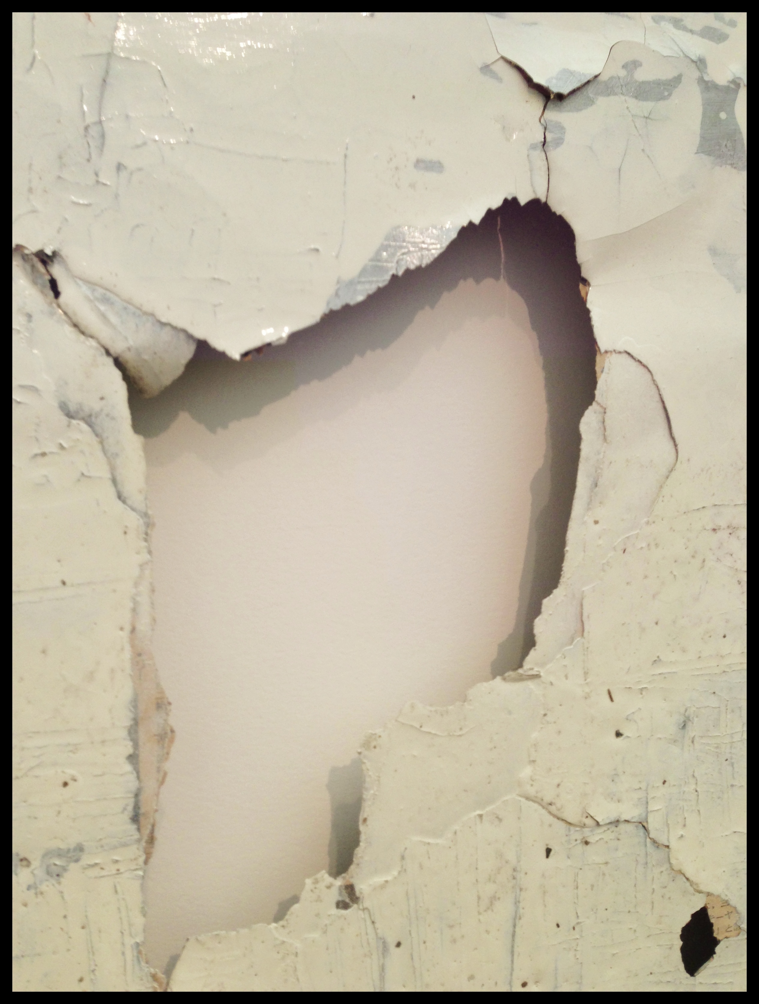 Shimamoto, however, literally guts the surface, introducing the presence of holes to his compositions. The distinction between building up and pushing through is significant. Burri also explored the potential of the hole in his paintings, but through his tears the support, whether burlap, plastic, or canvas, remains visible. Shimamoto presents something quite different: a suggestion of space beyond, a volume both physical present and conceptually suggested. Through these voids, these fissures, the layers of material are made more apparent. The shine from the white, industrial laquer is placed in distinct contrast to the white wall behind and the white of the wood frame around. As the viewer moves, shadows appear and dissipate, the multiple tears taking on various tones of darkness and dramatically playing off one another. In Mudai (1950), the circular hole in the center right of the composition is so small, it appears almost like a peephole, luring the viewer into a space of complete darkness as opposed to the piece’s largest tear above it. I logically know that the wall exists behind both and yet as the shadows move, as I move in closer, I cannot help but imagine remote and expansive spaces moving behind the piece as well as extending out from it.