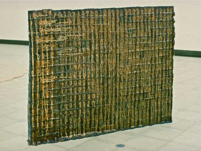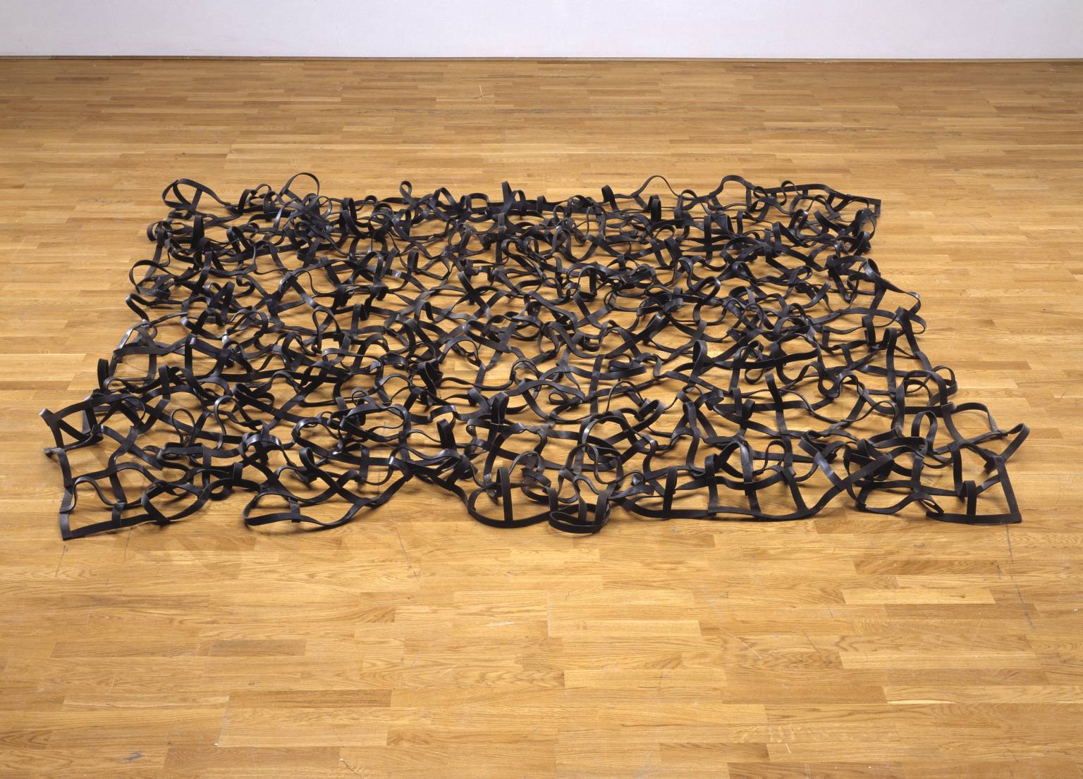 What becomes evident in looking at his sculptures from the 1970s is just how much attention and responsibility is given to materials. This becomes clear in comparing, for example, No. 1 or No. 2 with No. 3. All three works rely on a similar strategy of joining together small, thin pieces of material in an irregular grid type form. In the case of the latter, constructed with strips of black rubber, however, the connotations and effect of the work drastically alters. The fragility and lightness of the pieces made with wood is replaced by a sense of heaviness, the properties of the material unavoidably weighing the structure down. There is the implication of greater flexibility and the subtle sheen coming off the rubber evokes a completely different type of tactility, but the material specificities also alter the ability of the viewer to see through the work, collapsing the spaces in between into a darker, more chaotic mass.