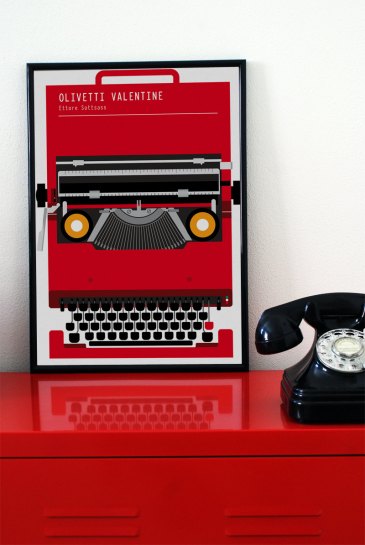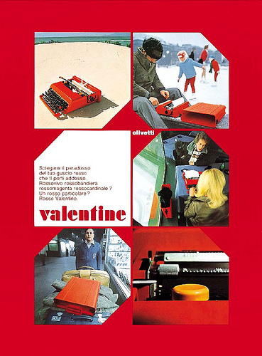 I often and embarrassingly find myself, usually during periods of intense writer’s block, gazing down at the Macbook Air I am typing this post on, and thinking to myself, “Jesus, this thing is beautiful.” While admiring its minimalist design and happily feeling its amazing portability as I place it in a bag to take to let’s say the park or the ice skating rink pictured in the above Valentine advertisement, I am equally aware that within a few years time there will be a new Apple writing device to covet. Sottsass’s Olivetti typewriters continue to enchant and circulate in our current digital age not just because they are colorful or now possess a cool, vintage aesthetic, but because they suggest a kind of permanence we rarely get from the things populating our workspaces today. There are countless youtube videos and internet pages devoted to using, maintaining, and repairing old typewriters; these things that are now essentially relics of the future past. Typerwriters both reside as dead, iconic objects in numerous museum collections and inspire numerous Etsy-Pininterest-Hipster decorative schemes, while also refusing to relinquish their intended functionality. They continue to find a place in this world not as something to decorate the wall or bookshelf in a fashionable loft in Brooklyn but as something with which to, well, type.