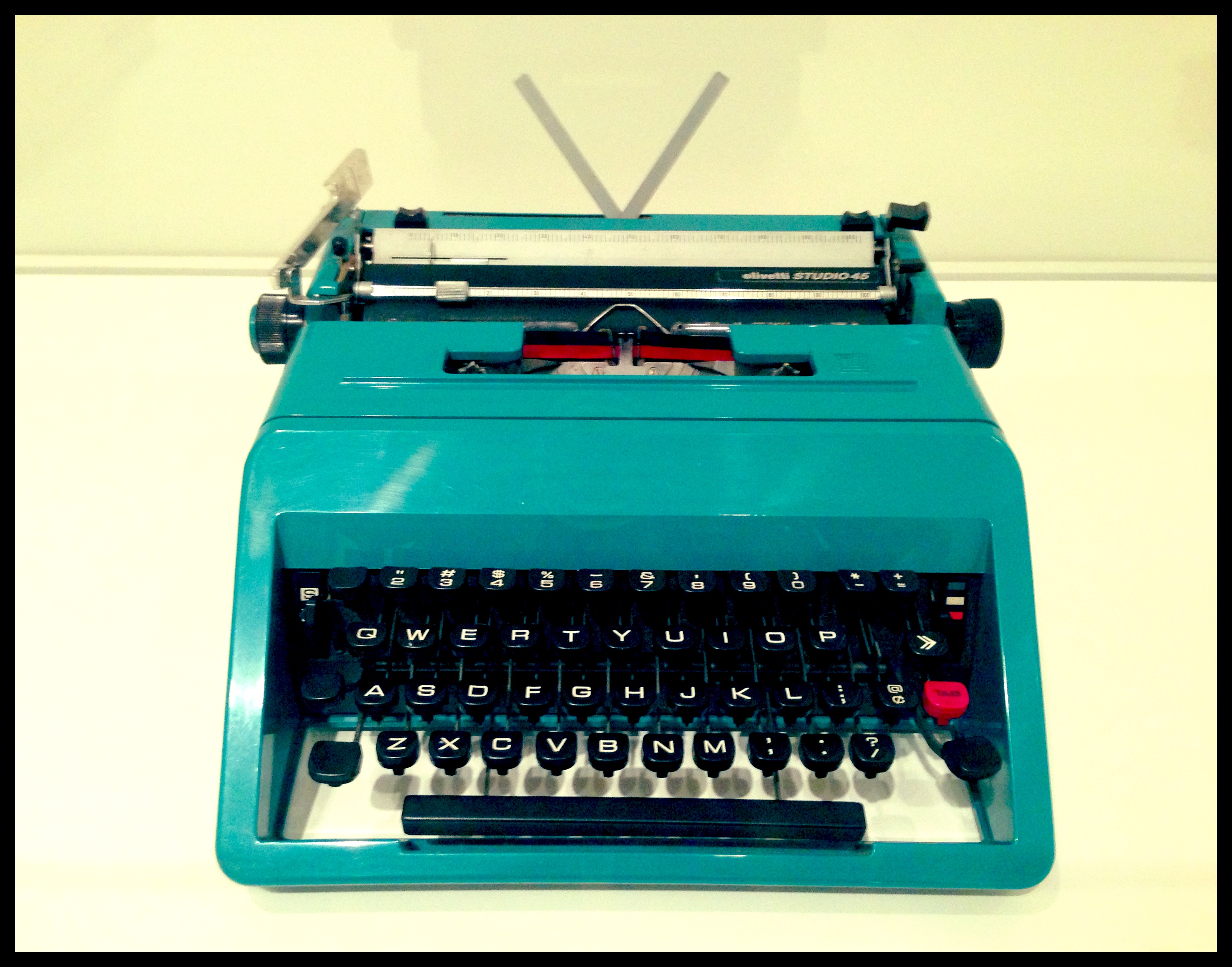 The other day, while mapping out an upcoming museum visit for the class I am teaching this summer, I found myself wandering through the design and architecture galleries at the Art Institute of Chicago. I have been thinking a lot lately about the often tenuous line that separates a designed object and a sculptural thing. The current exhibition, Sharing Space: Creative Intersections in Architecture and Design, culled from the AIC’s permanent collection, seemed like a particularly apt opportunity to further consider this liminal space, since the exhibition takes as its focus the point where two disciplines, in this case architecture and design, meet. Among the numerous schematic drawings of three-dimensional things, sculptural models, and hybrid objects was an bright teal Olivetti Studio 45 typewriter designed by Italian postwar artistic polymath Ettore Sottsass. Admittedly the color is what initially grabbed my attention, but the more I stood and looked at this object the more I was struck by its overall aesthetics: the considered selection of the font on the keys perfectly complementing the simple, clean lines of its frame; the single red key balanced by the red stripe on the ribbon; the small details, like the teal ends of the knobs, aspects that go beyond mere functionality. Sitting in its well-lit vitrine, its elements casting dramatic shadows, this object, this thing made to type words on paper, possessed some serious presence.